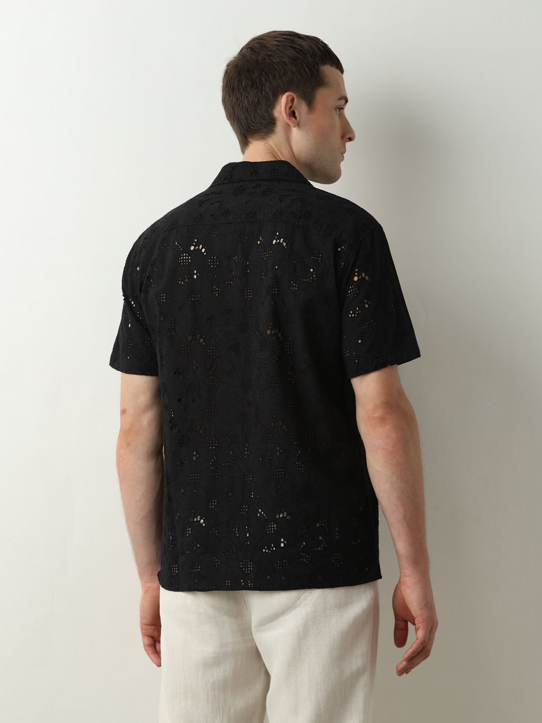Crafted with delicate broderie anglaise detailing, this piece exudes timeless sophistication. Envelop yourself in comfort while staying cool in the summer heat. Finished in a sleek black hue, this shirt effortlessly transitions from casual outings to more refined occasions.