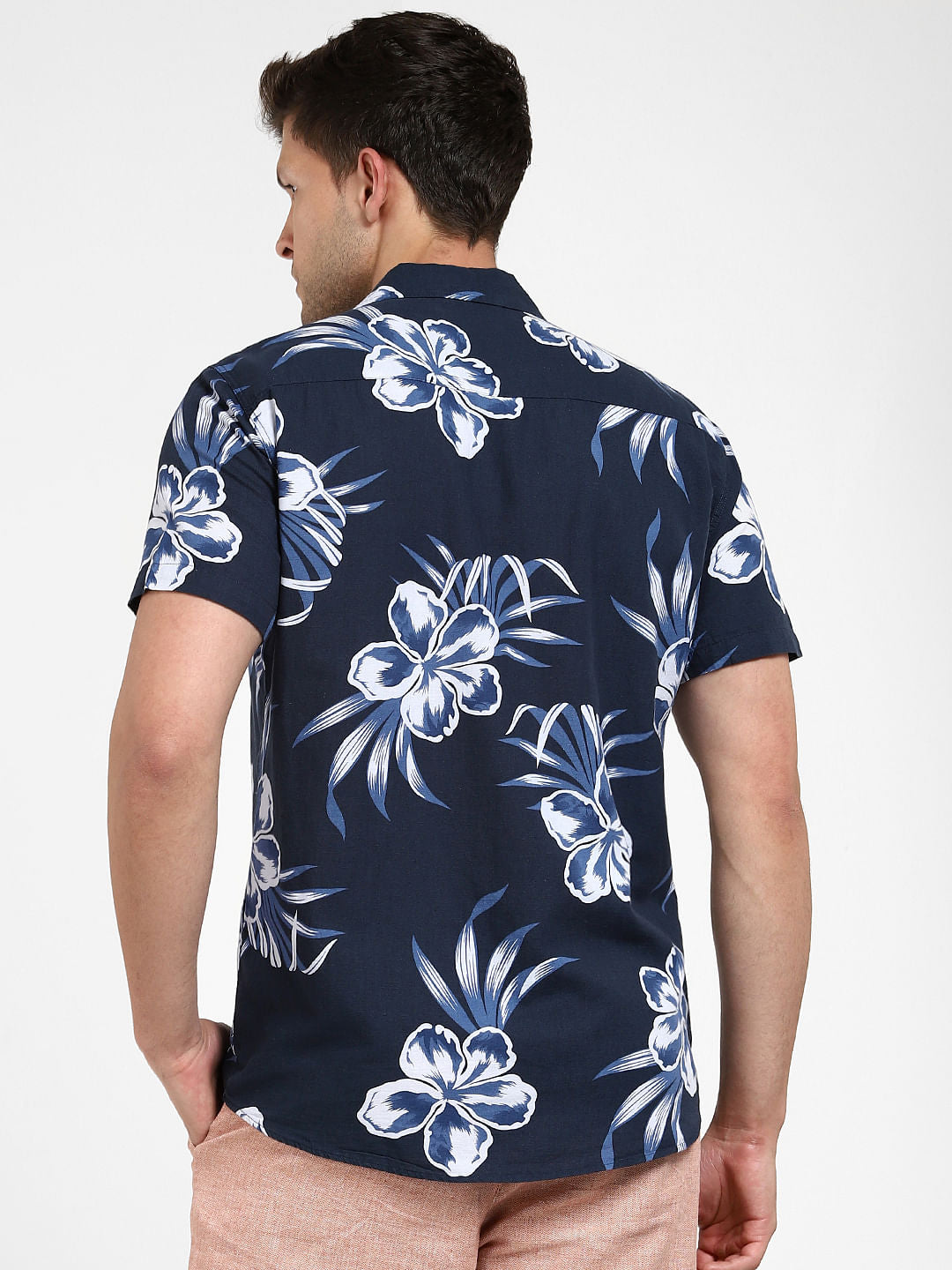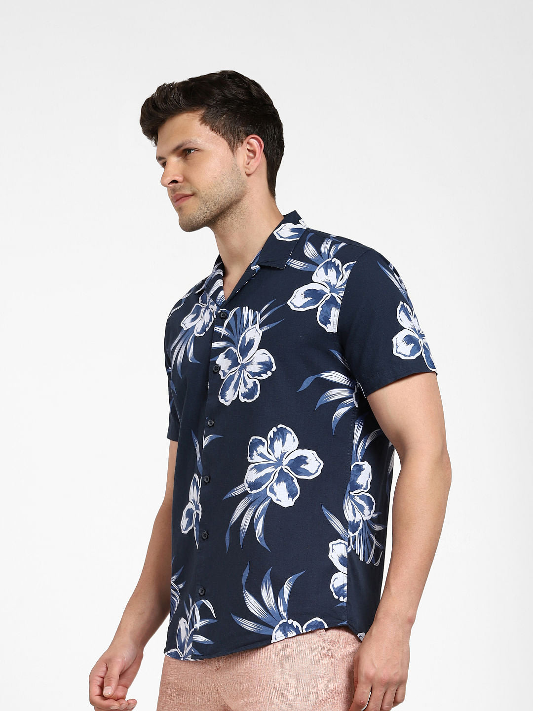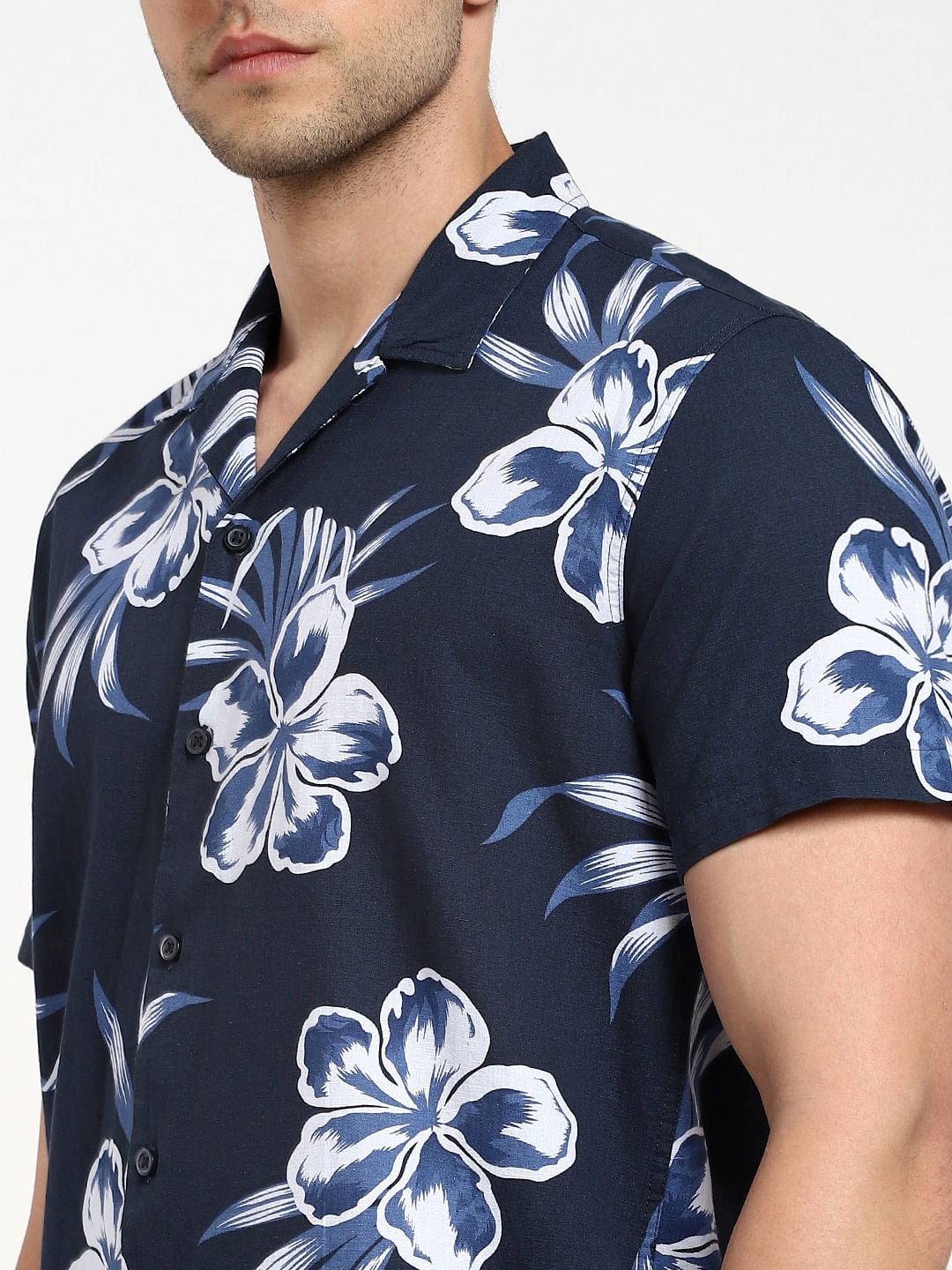NAVY BLUE FLORAL Cuban Collar Shirt