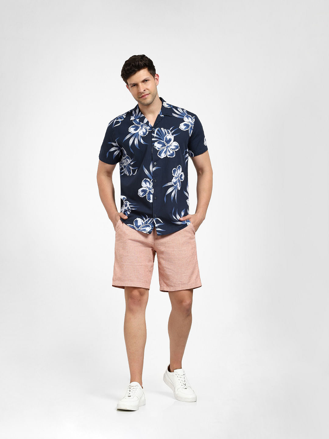 Men's floral print linen and recycled cotton blend resort shirt cut in a regular fit. Features a classic button placket and shirt collar. Style with chino shorts or denim shorts and sneakers for a laid-back summer look.