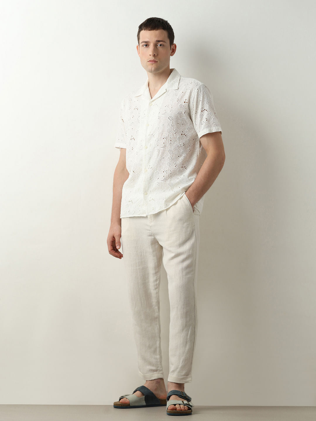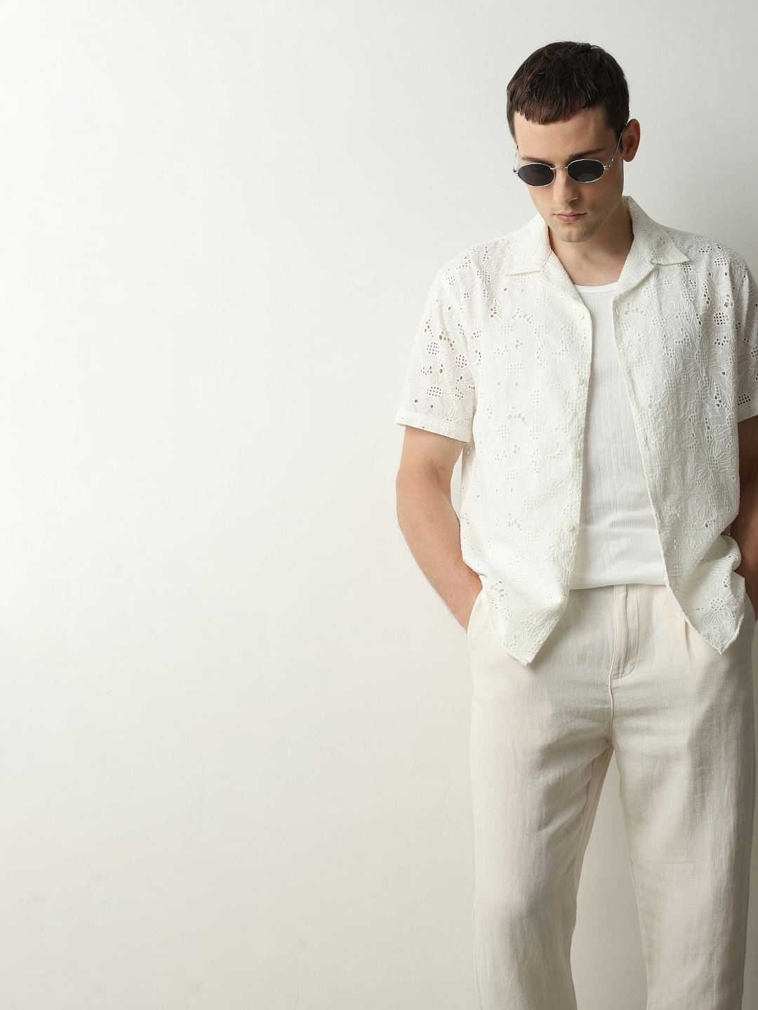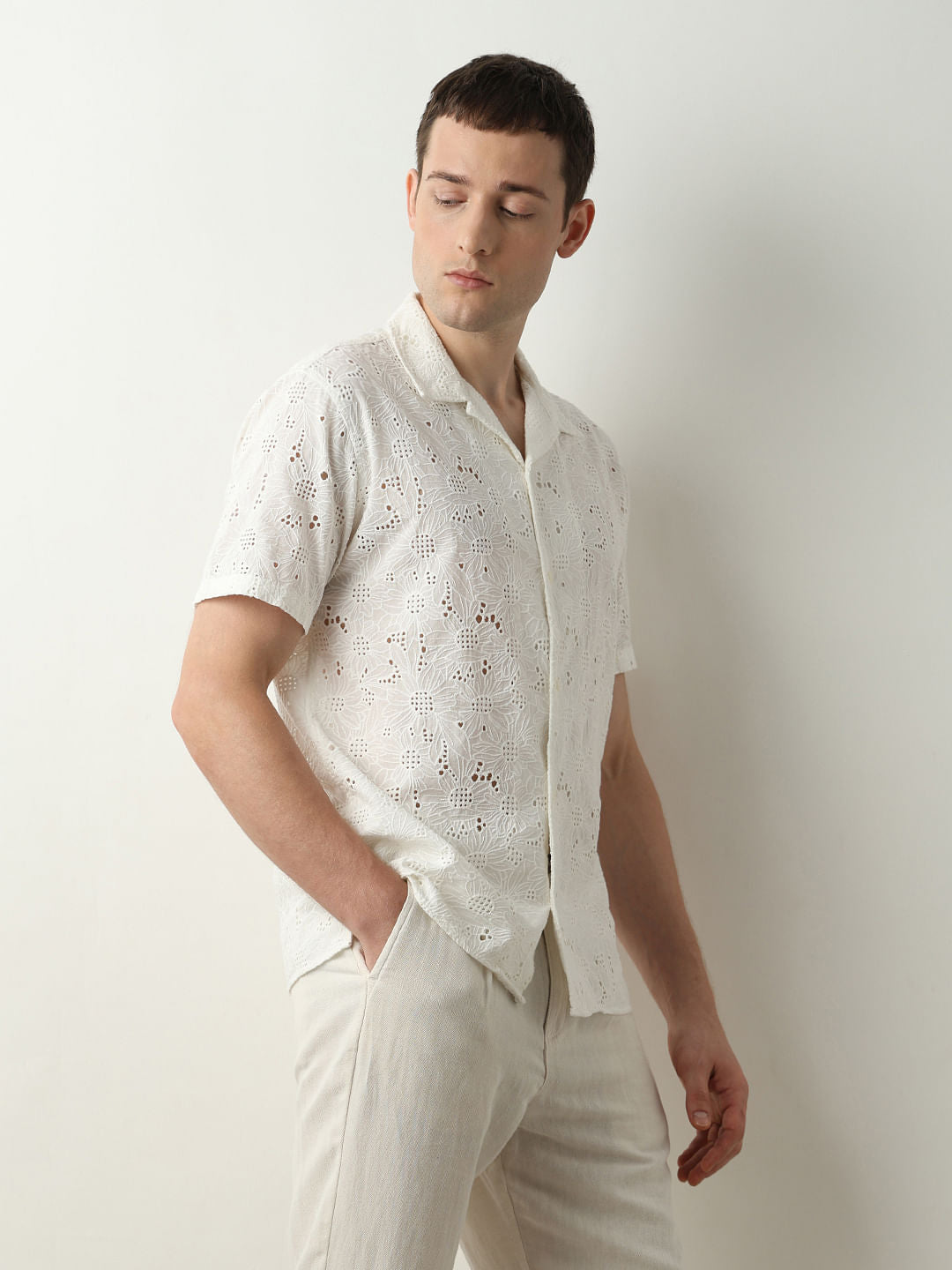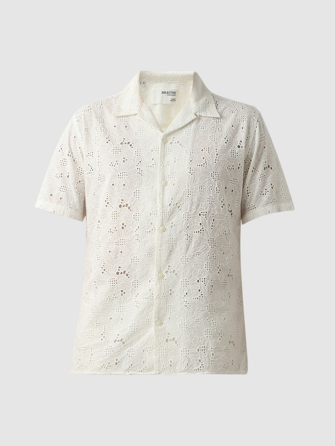 Crafted with delicate broderie anglaise detailing, this piece exudes timeless sophistication. Envelop yourself in comfort while staying cool in the summer heat. Finished in a sleek off-white hue, this shirt effortlessly transitions from casual outings to more refined occasions.