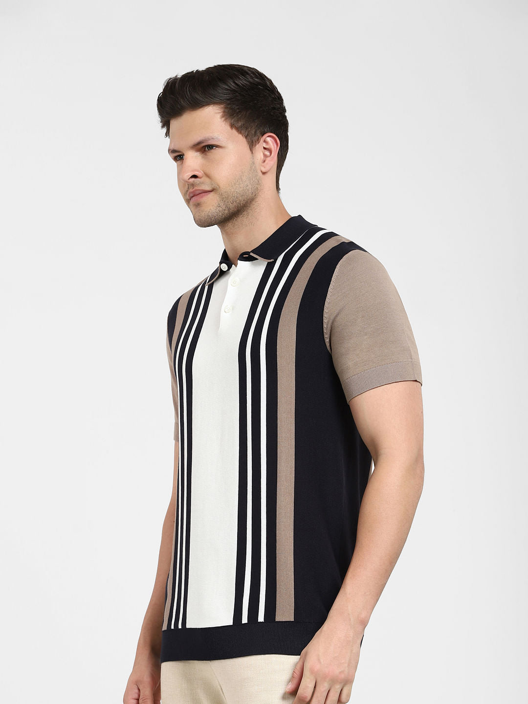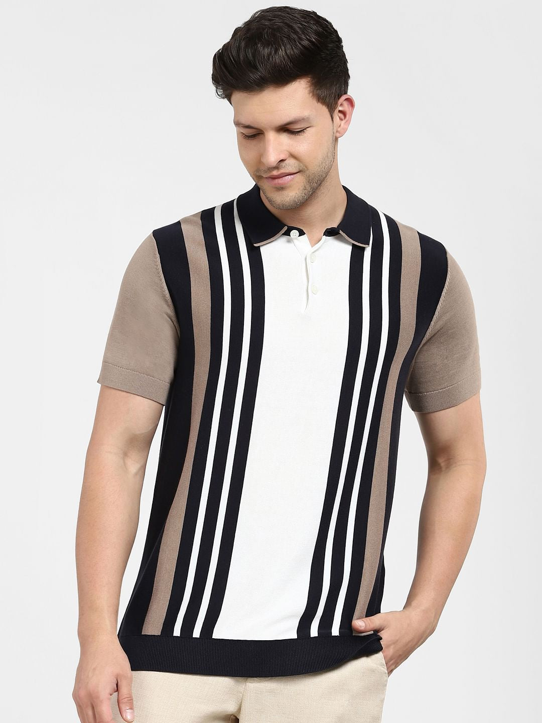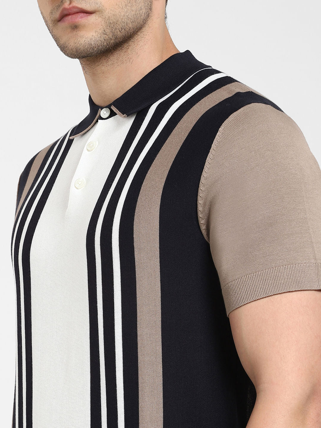Men's organic cotton blend knitted polo tee in a striped colourblocked pattern and cut in a regular fit. Features a button placket down the collar and short sleeves. Perfect to wear with black shorts and sneakers.