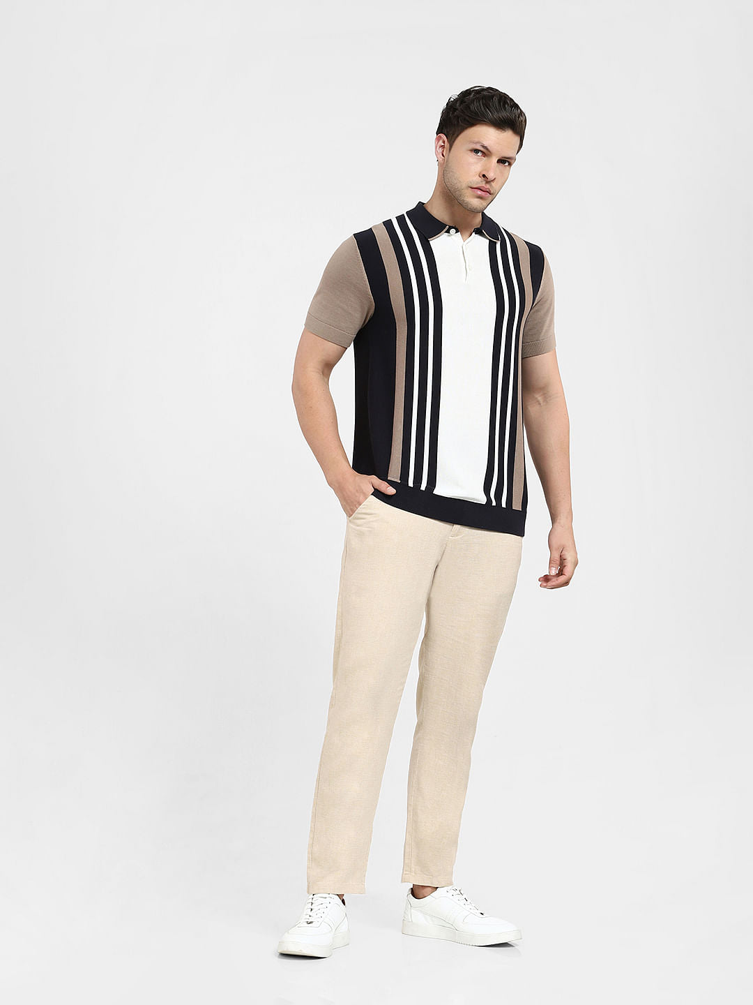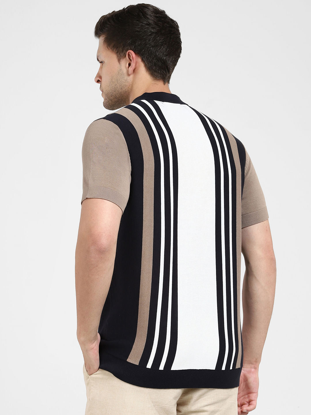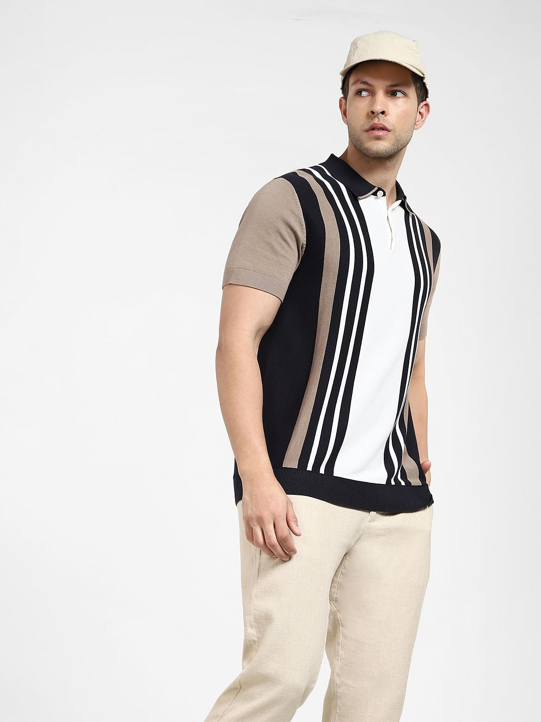 Men's organic cotton blend knitted polo tee in a striped colourblocked pattern and cut in a regular fit. Features a button placket down the collar and short sleeves. Perfect to wear with black shorts and sneakers.