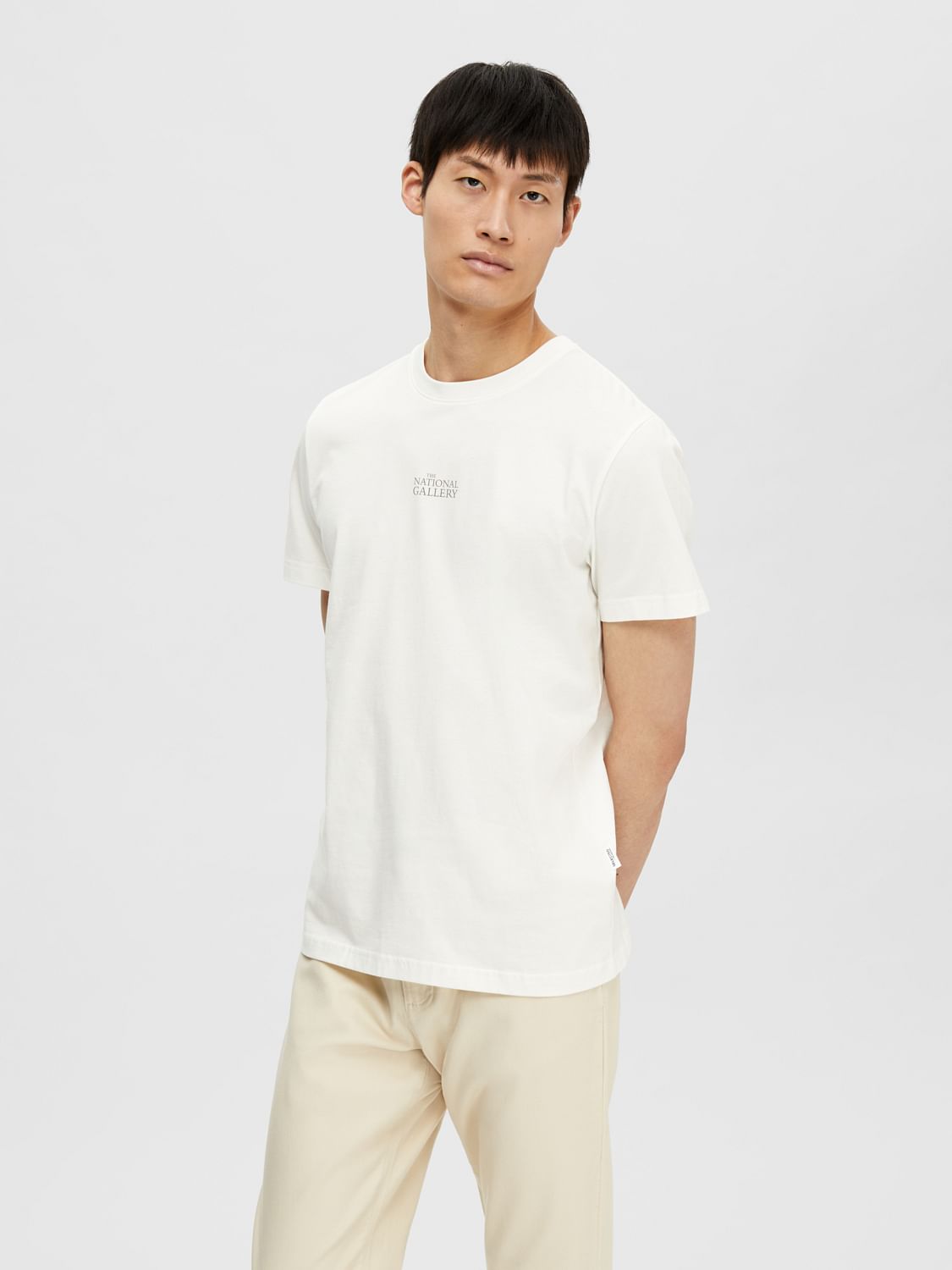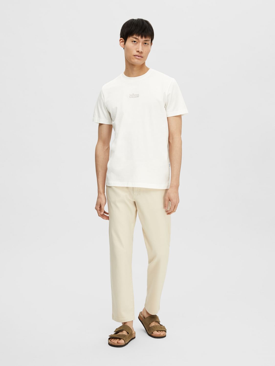 Classic crew neck t-shirt made from organic cotton fabric. Features a picturesque print of a painting and text print. Cut in a slim fit. Style it with a pair of beige pants and espadrilles or slip-ons for a smart-casual look.