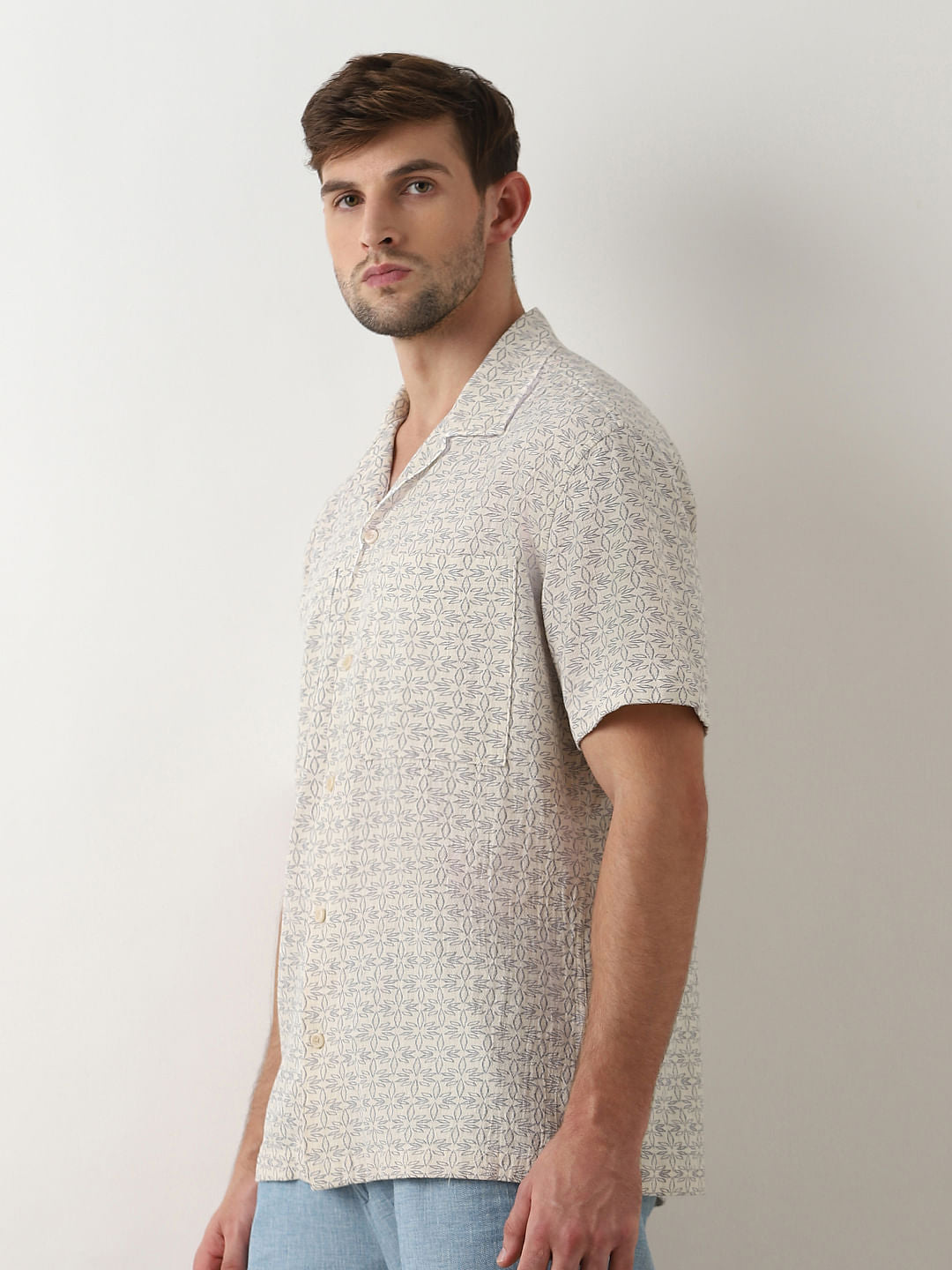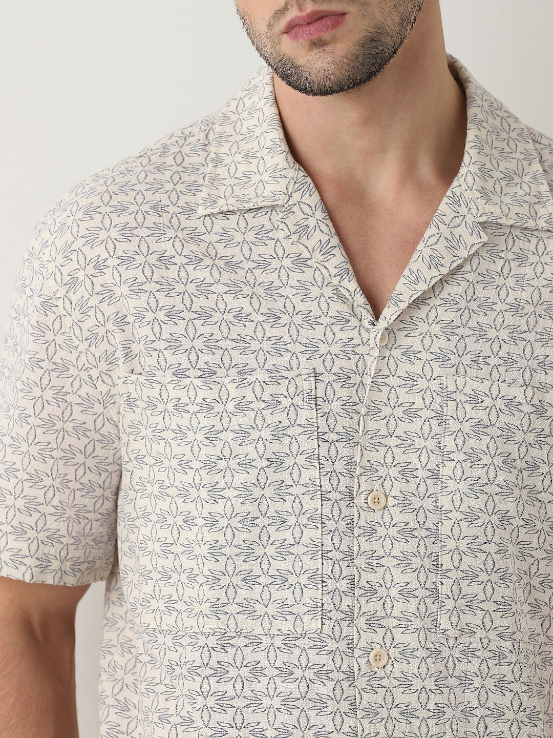 Beige Printed Cuban Collar Short Sleeves Shirt