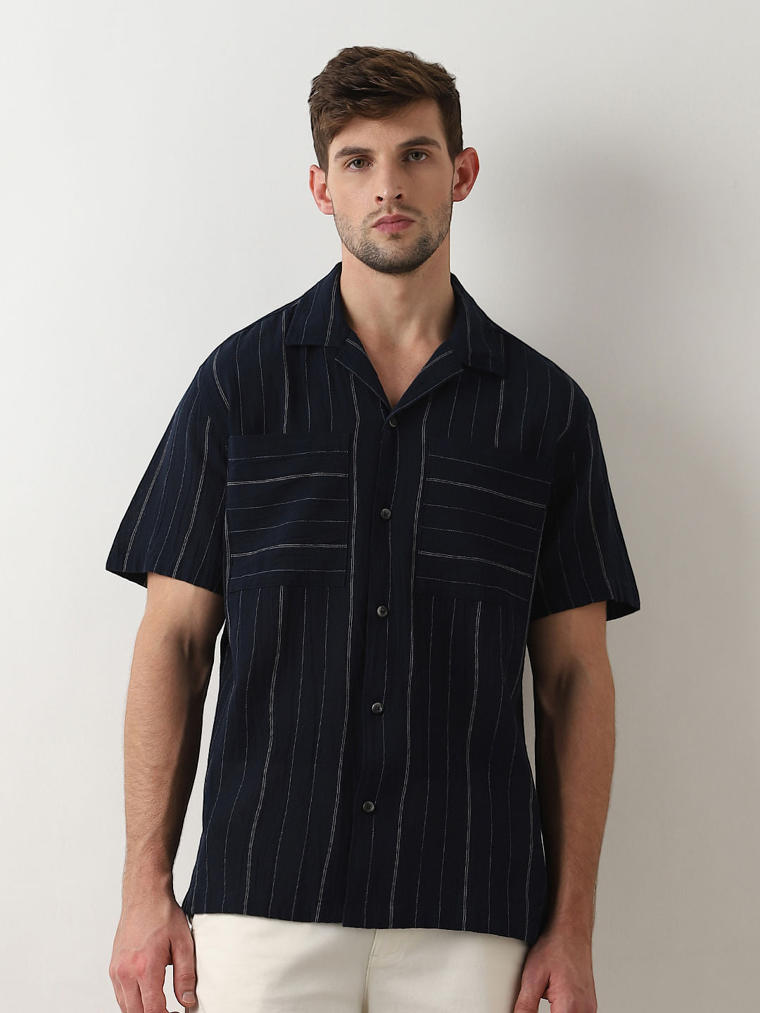 Introducing our distinguished men's shirt, exuding timeless elegance and comfort in every stitch. Crafted with meticulous attention to detail, this shirt boasts a classic shirt collar and short sleeves for a refined yet relaxed look. Its button fastening ensures effortless wear, while the inclusion of chest pockets adds practicality without compromising style. The straight hemline offers a polished finish, complementing its regular fit silhouette.