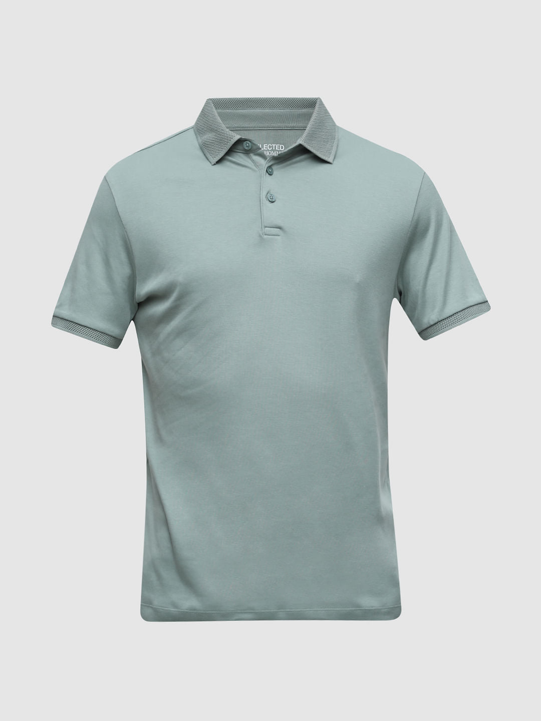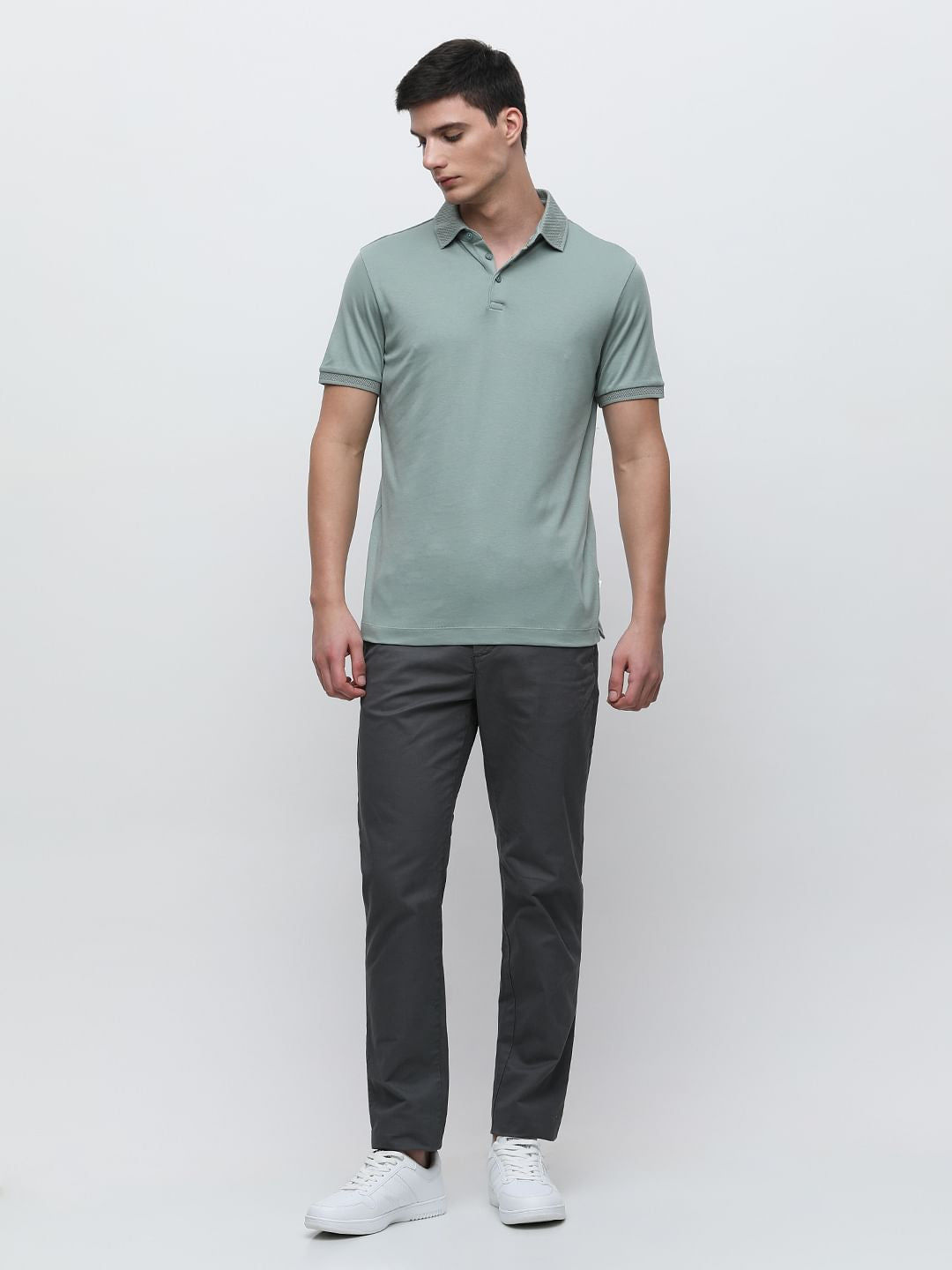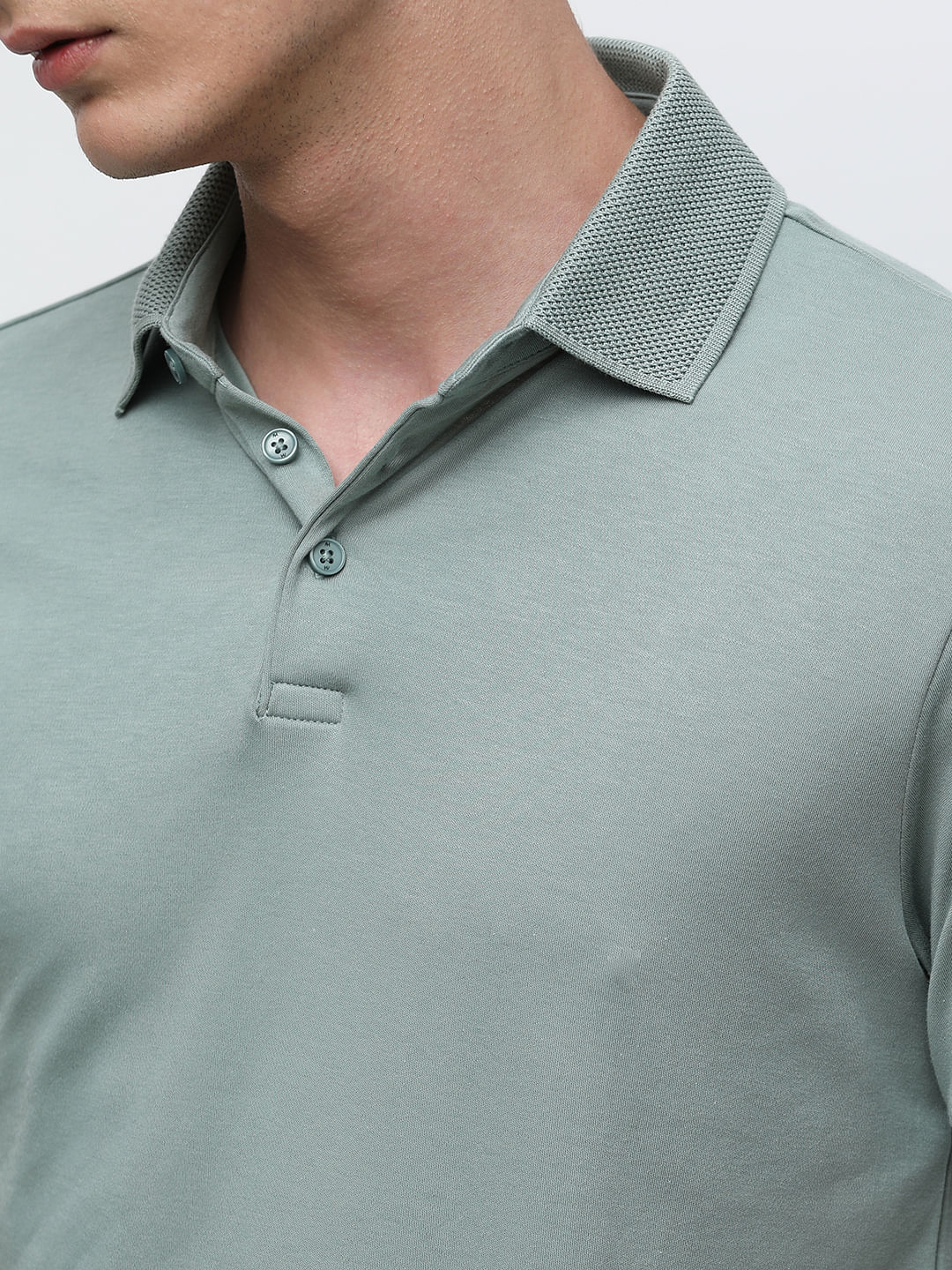Men's green polo t-shirt designed with a Jacquard collar and inner logo text detailing. Made from 100% cotton fabric, offers a regular fit, and has button down the collar placket. Keep it casual by pairing it with jeans and sneakers.