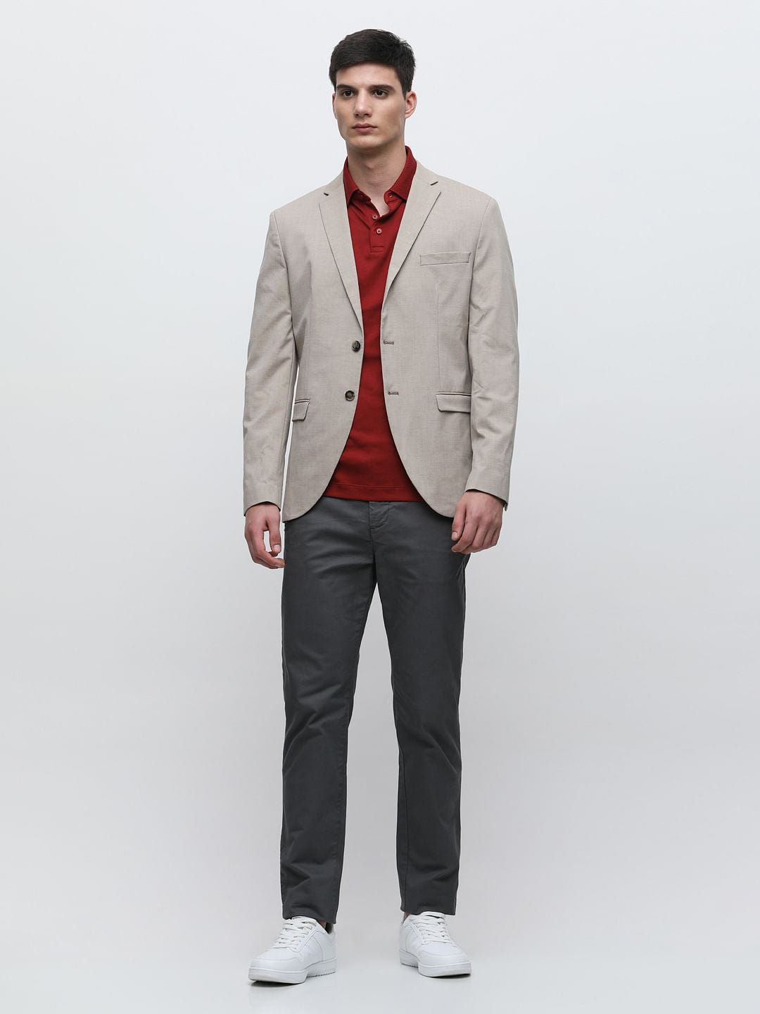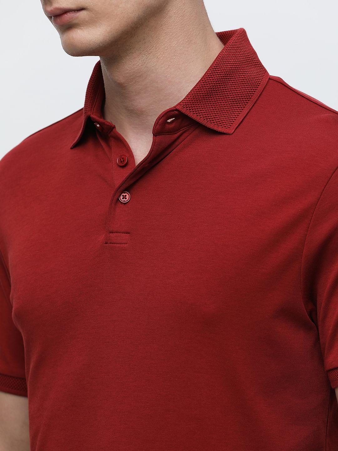 Men's dark red polo t-shirt designed with a Jacquard collar and inner logo text detailing. Made from 100% cotton fabric, offers a regular fit, and has button down the collar placket. Keep it casual by pairing it with jeans and sneakers.