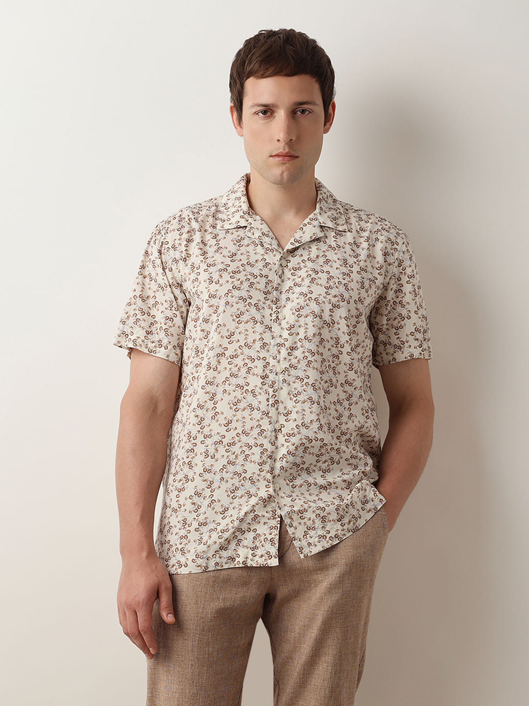 Introducing the Beige Floral Cuban Collar Shirt, a sophisticated blend of cotton and Tencel fabric. This shirt combines classic style with modern elegance, featuring a striking floral print that adds a touch of refinement to your wardrobe. Its short sleeves ensure comfort and versatility, making it an ideal choice for both casual and semi-formal occasions. Elevate your look with this distinctive piece that effortlessly merges comfort with impeccable style.