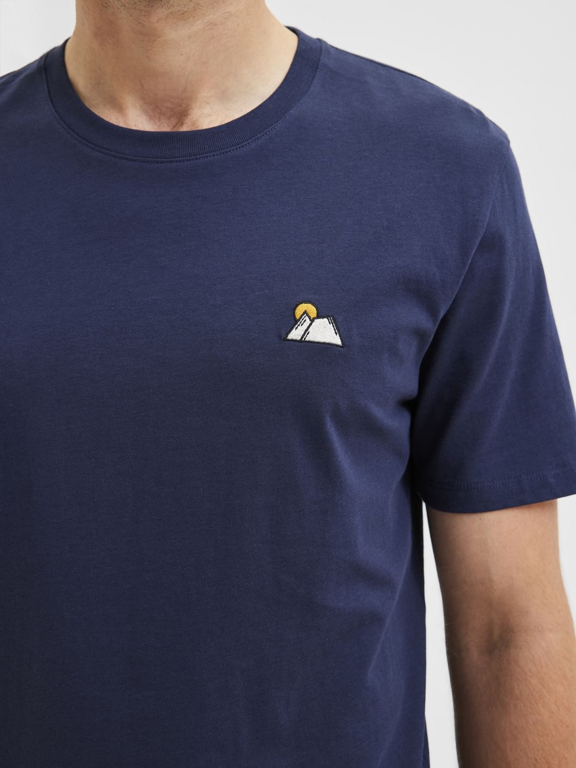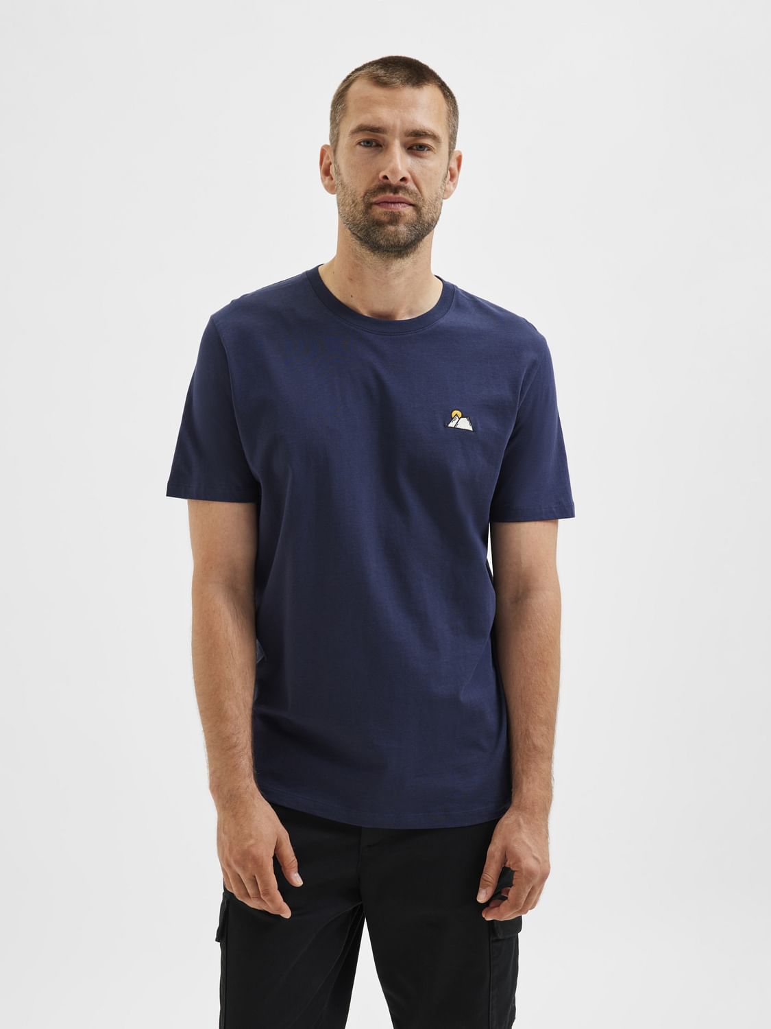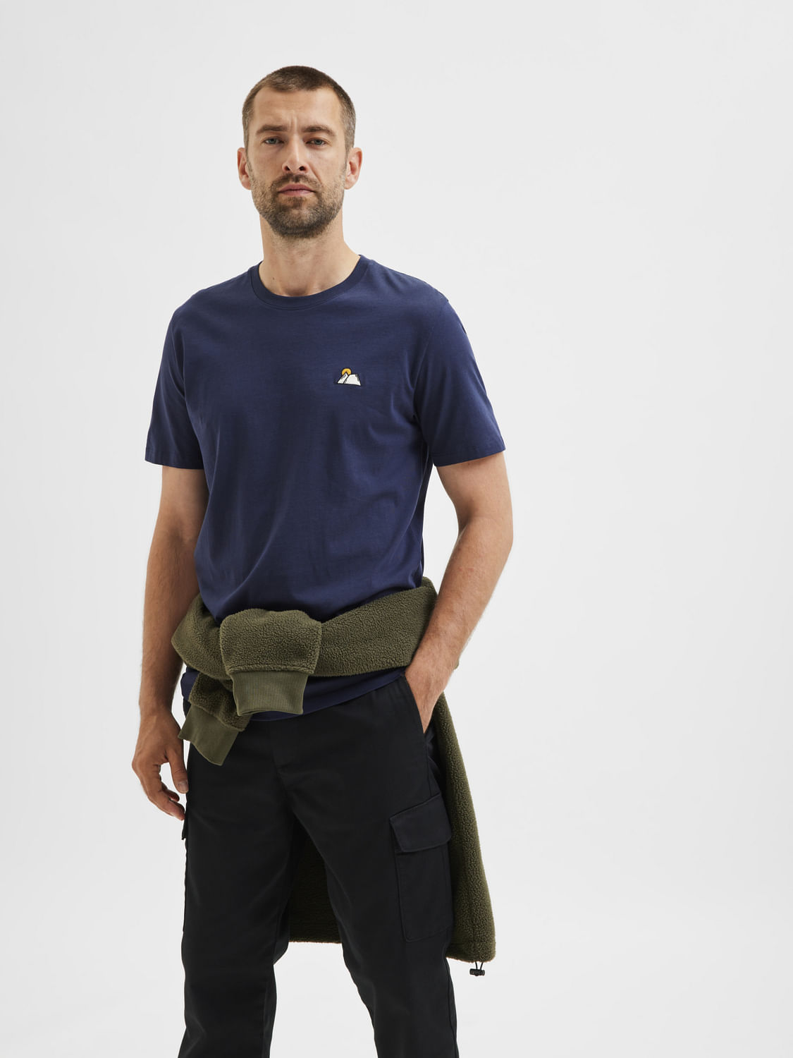 Classic blue organic cotton T-shirt for men, features a small minimalistic graphic print. MADE WITH ORGANIC COTTON.