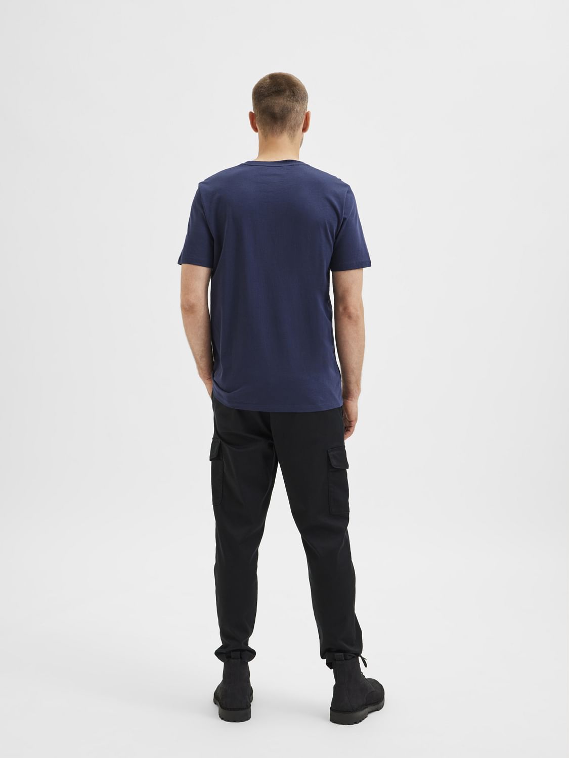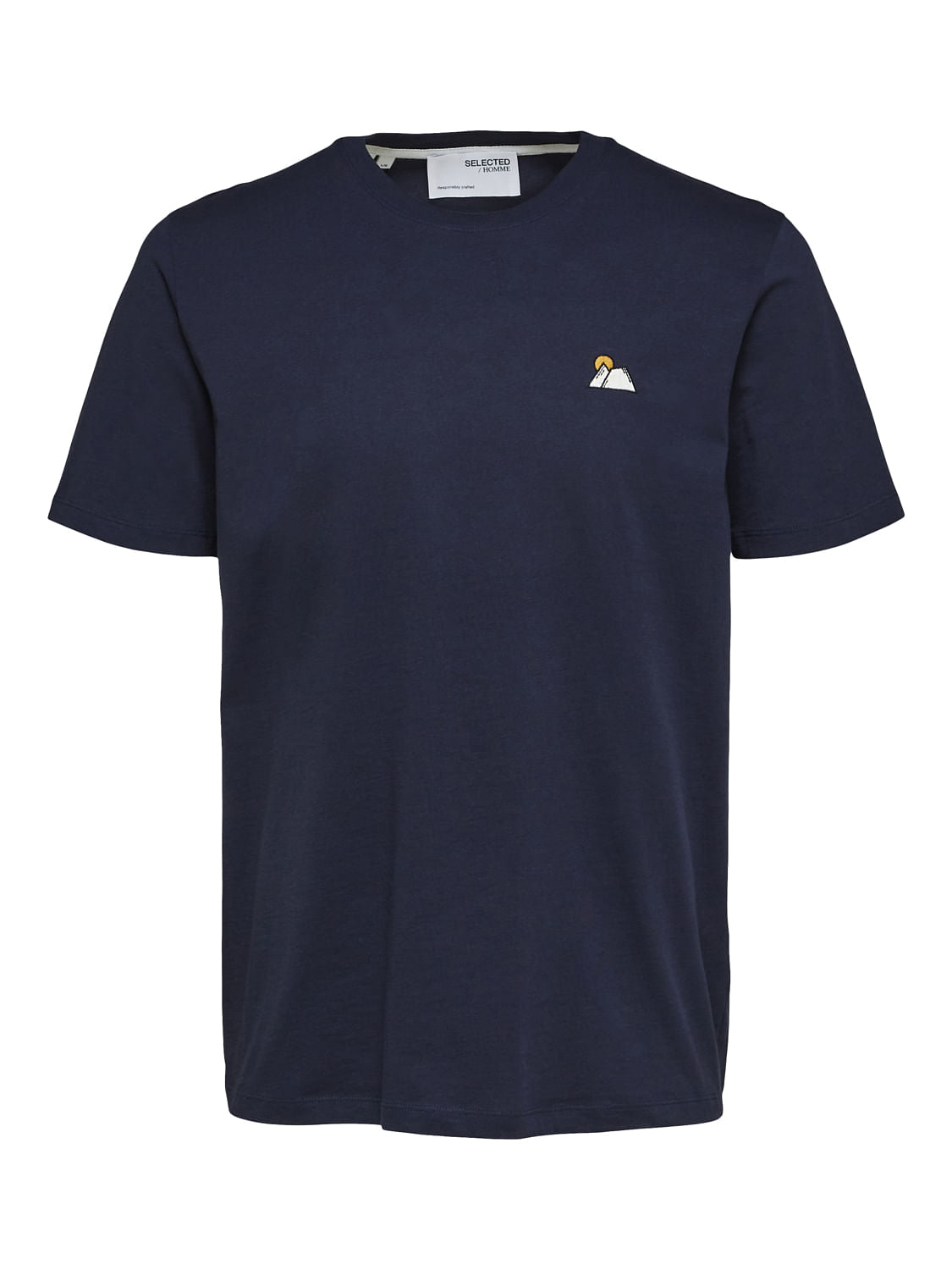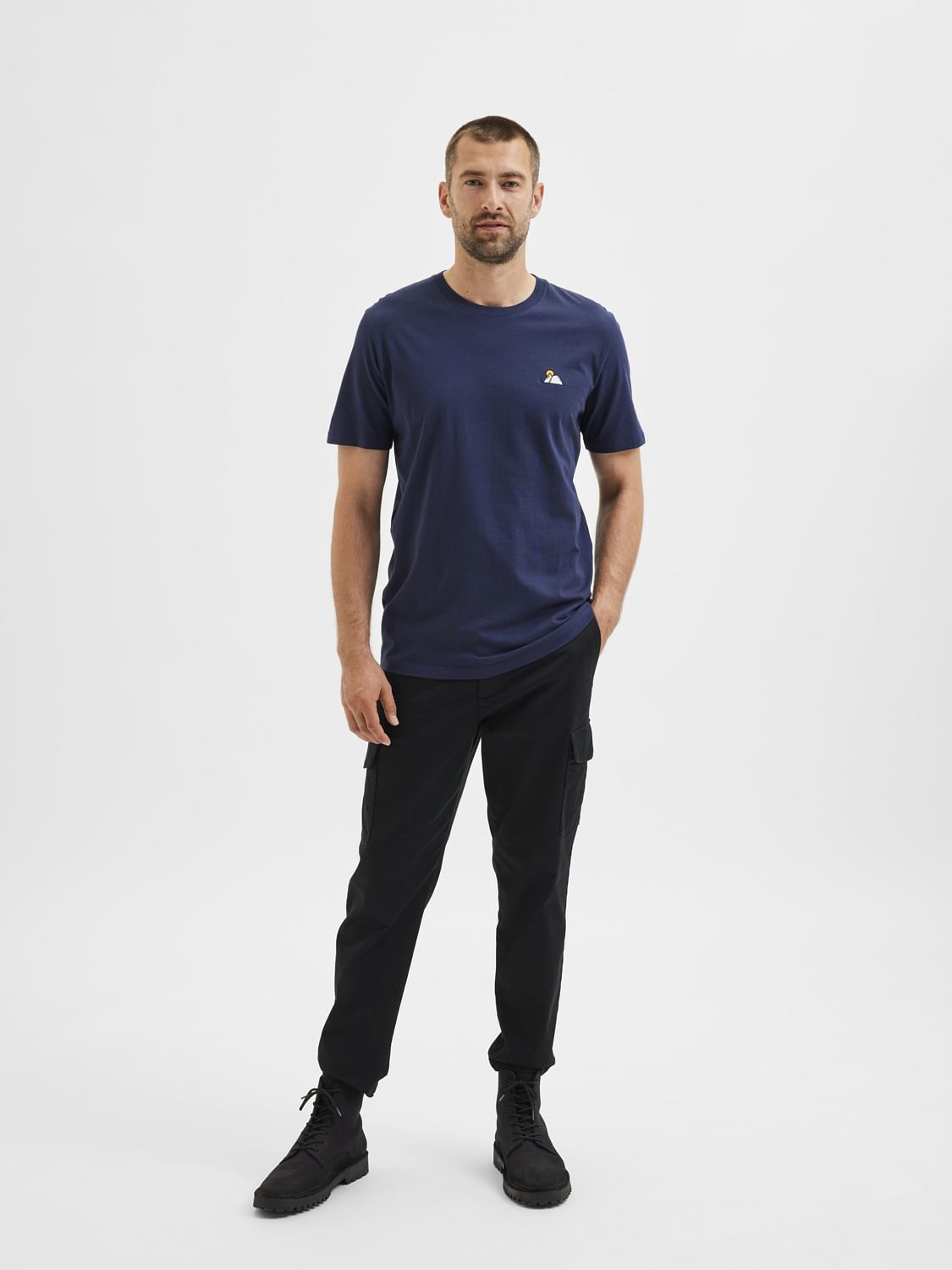 Classic blue organic cotton T-shirt for men, features a small minimalistic graphic print. MADE WITH ORGANIC COTTON.