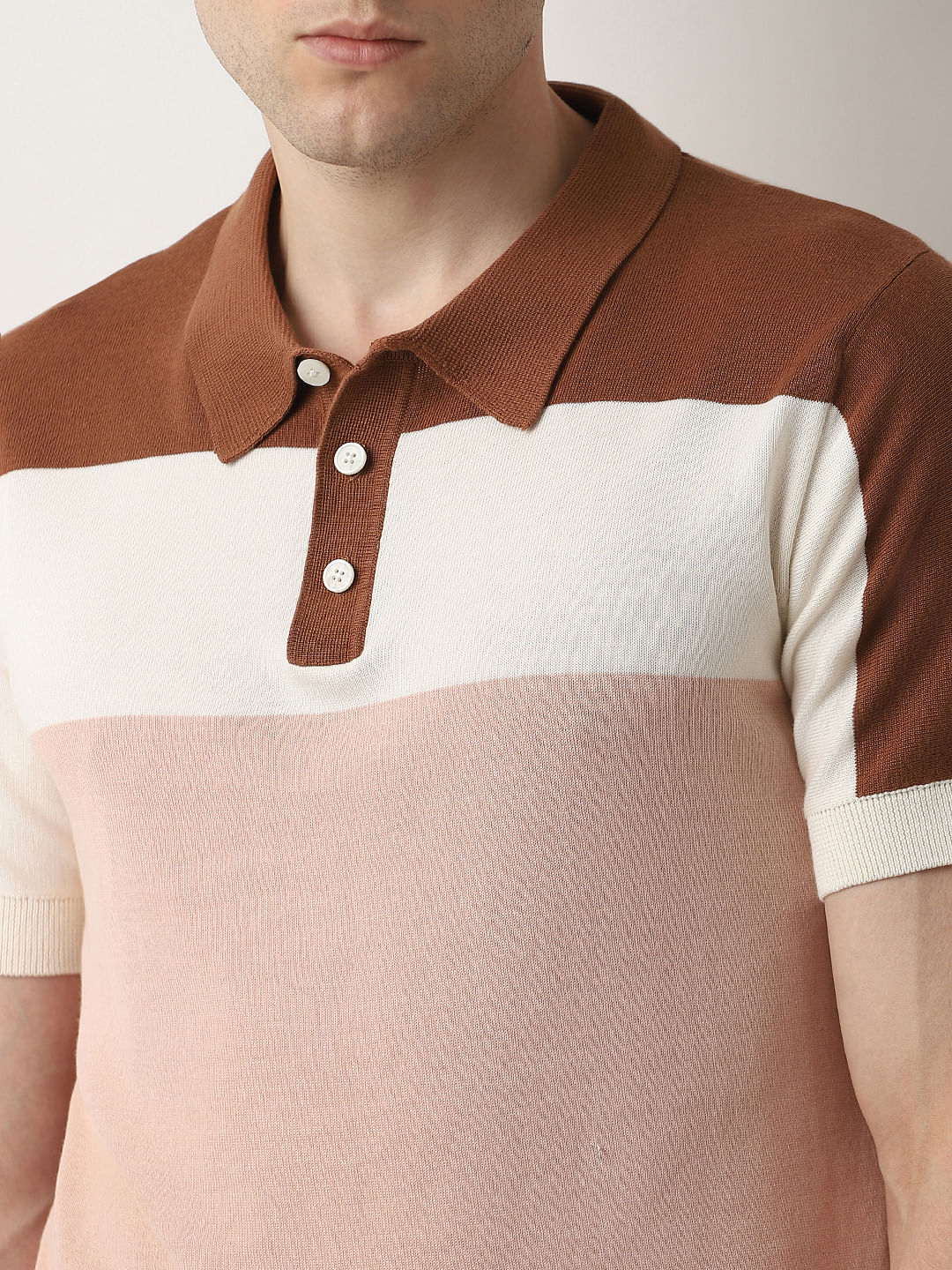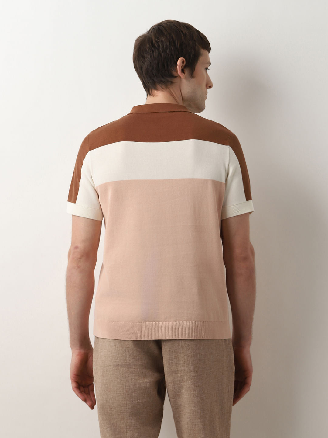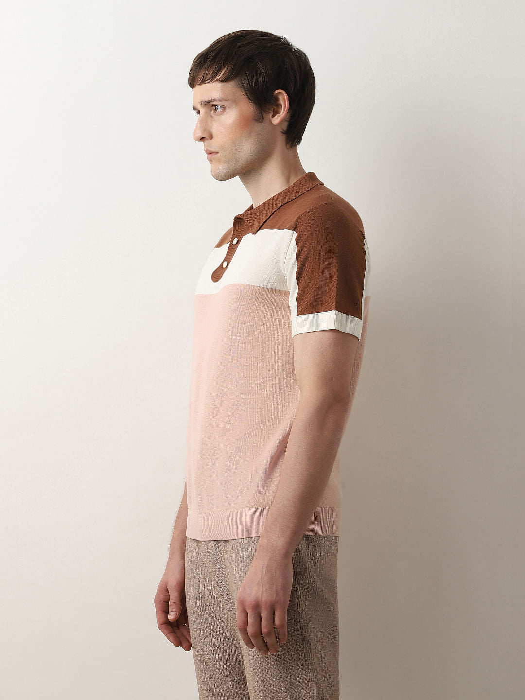 Men's organic cotton knitted polo t-shirt rendered in a colourblocked print with short sleeves and a classic front button placket down the collar. This product is made with organic cotton. Organic cotton is grown without the use of harmful chemicals. Organic cotton farming protects natural resources and farmers.