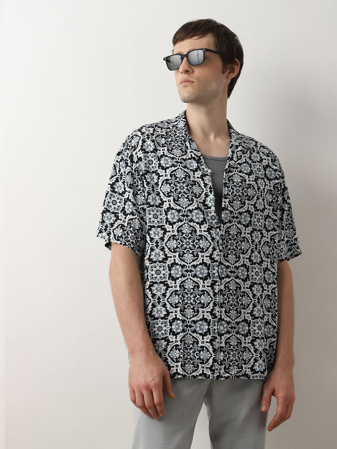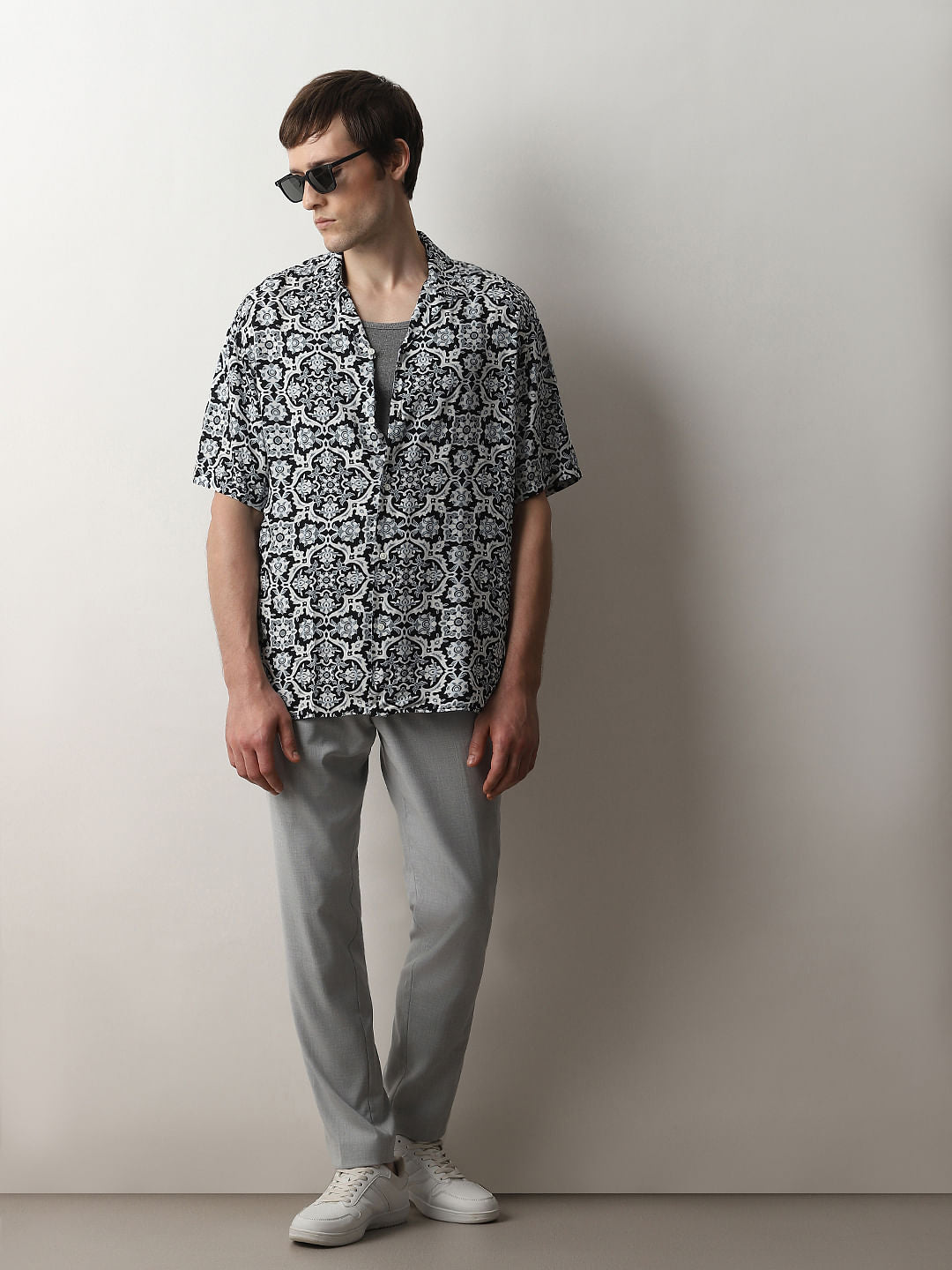 Elevate your summer wardrobe with our effortlessly stylish men's shirt, designed to bring a touch of laidback sophistication to your sunny days. Crafted with a classic shirt collar and short sleeves, this shirt exudes casual charm while maintaining a refined edge. The button fastening adds a polished finish to the ensemble, ensuring a seamless blend of comfort and style. Experience the pleasure of a soft and comfortable wear, thanks to a special treatment that enhances the fabric's feel. The straight hem and side slits contribute to a relaxed fit, allowing you to embrace the season with ease. A subtle yet distinctive touch lies in the all-over print, creating a harmonious pattern that extends across the entire surface of the shirt. Whether you're strolling along the beach or attending a casual outdoor gathering, this shirt is your go-to choice for a timeless, summer-inspired look.