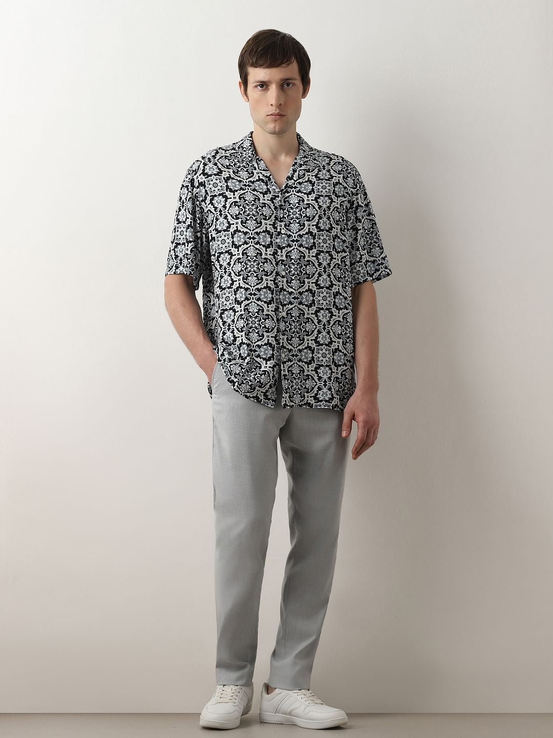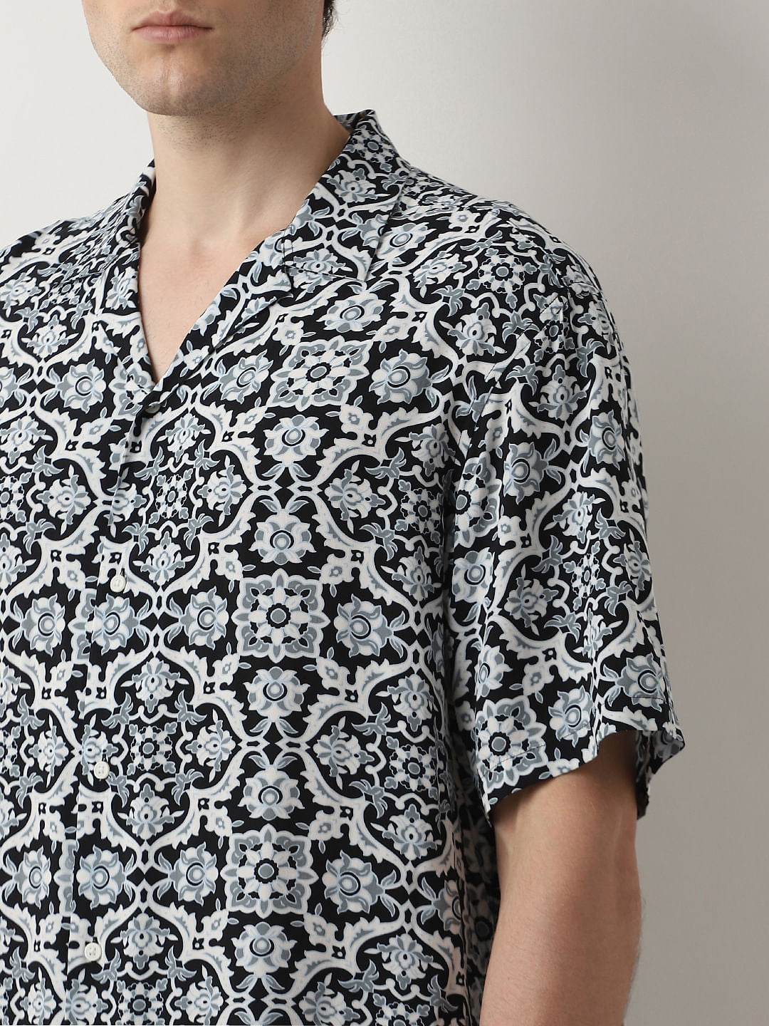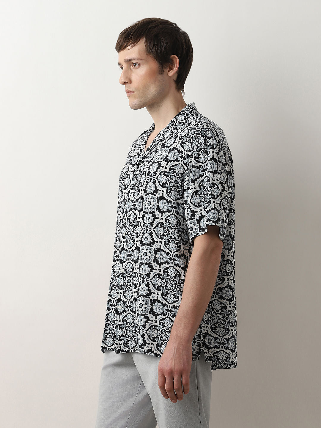 Blue Printed Cuban Collar Short Sleeves Shirt