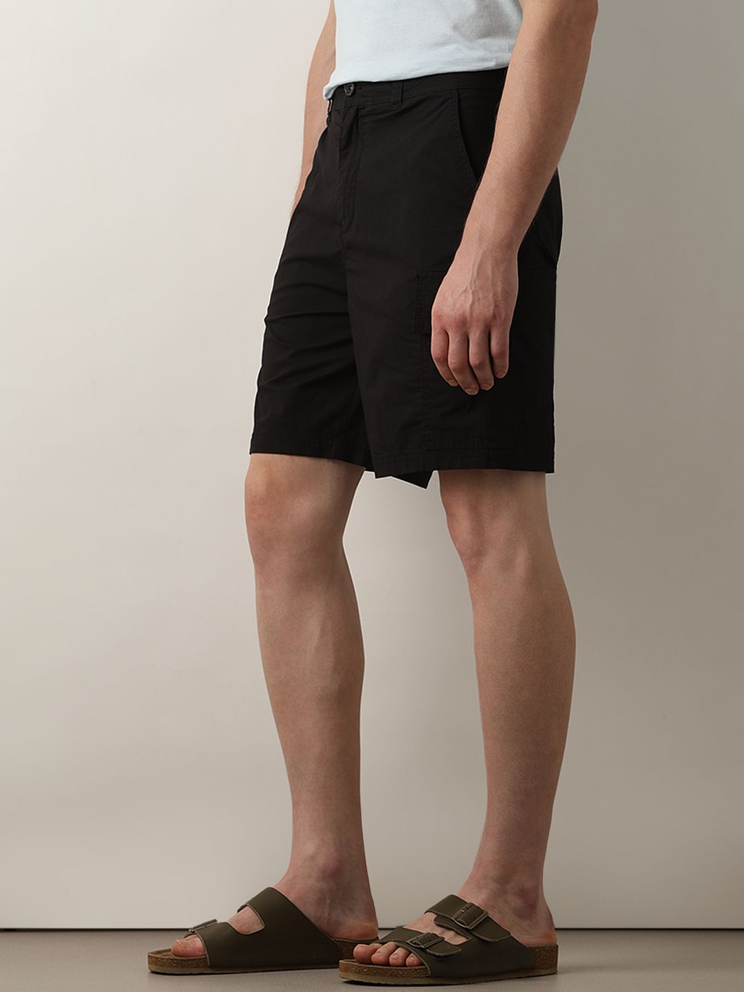 Men's organic cotton blend cargo shorts rendered in a solid black hue. Sitting mid on the waist, these cargo shorts form the epitome of laid-back style owing to its classic look, multiple pockets, and a comfortable regular fit. Build your summer wardrobe as you add this staple to your collection and pair it with casual tees and sneakers for a weekend outing.